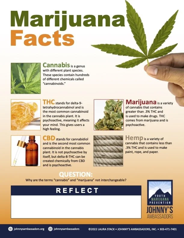 Johnny’s Ambassadors is on a mission to educate teens, parents, and communities about the dangers of today’s potent THC products (marijuana, dabs, vapes, edibles) on adolescent brain development, psychosis, and suicide. We focus on youth awareness, prevention, and education regarding THC. We share data-driven facts and clear messaging with teens and parents to reduce the likelihood they will use marijuana and stop progression to more problematic use. Visit the learning library of educational resources, research, news, and more.